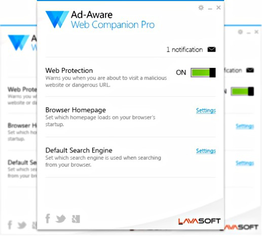 Ad-Aware Web Companion Pro interface divide into 3 sections – Web Protection feature to warned user when visit to malicious website or dangerous URL, Browser Homepage for user create home page loads when launch browser, Default Search Engine for setting browser use specific search engine that user preferred.