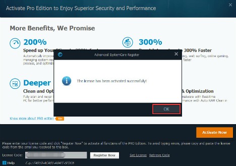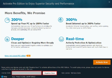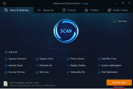 Once the download and install is complete, launch Advanced SystemCare 9, click “Enter code” under Activate Now button at the bottom right of the main screen to open the registration window.