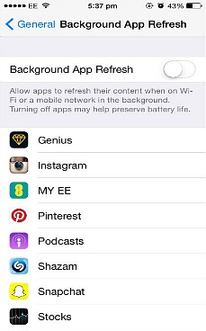 Note: “Background App Refresh” means that the app will run in the background and continually refreshes content when running on Wi-Fi or a cellular network. - Go to Settings > General > Background App Refresh and toggle the on/off switch. You also can turn Background Refresh off for all apps or just manage each individual app’s settings.