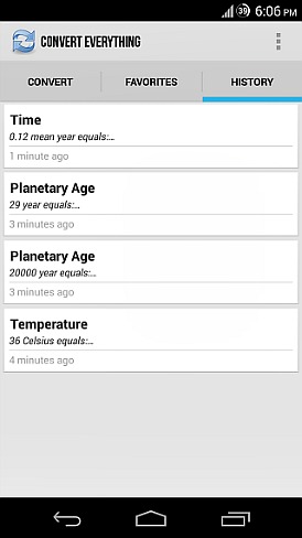 You can convert over a hundred units from simple scientific such as units lumber, torque, typography, radiation, dress and shoes size in different areas and everything in between by using Convert Everything. It is awesome to having this app to ease our daily life especially when travelling. On the home screen, you select the general category of conversion you wish to perform, and then input the unit and dimension in the following submenu. It is annoying when entry to the long list because there are a hundred of list to scrolling under the convert tab. No problem, just simply click the Favorites button while on that quantity’s screen and it’ll be added to your Favorite tab. You can also access your recently or updated converted quantities in the History section.