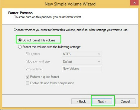 - In new simple volume wizard, click Next > Next > Next to assign a drive letter > Select “Do not format this volume” and then click Next.