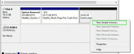 - Right click on the unallocated space and select New Simple Volume.