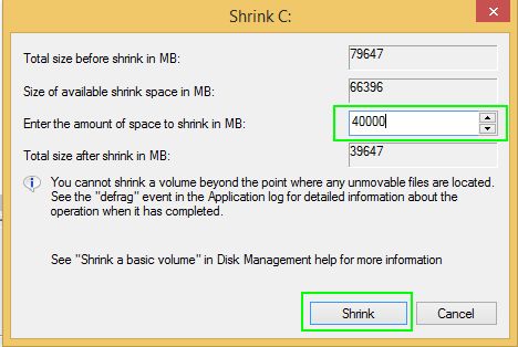 - Enter the amount to shrink (min 20GB), which will be the size for Windows 10 drive. Click Shrink to allocated space of PC hard drive.