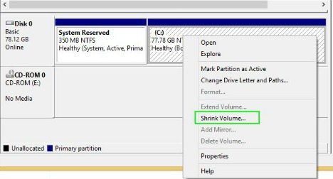 - Right click on C Drive and select Shrink Volume in the bottom window pane.