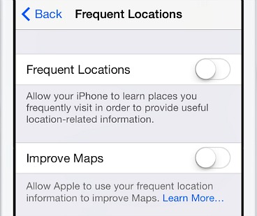 To disable Frequent Locations features, go to Settings > Privacy > Location Services > System Services. There, scroll to the bottom and switch off the Frequent Locations option. Users also can delete data that collected by tapping Clear History at the bottom of the screen.