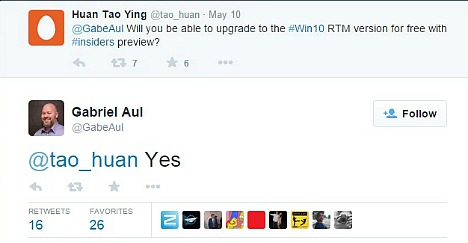 Recently, there has also confirmed by Head of Windows Insiders Gabriel Aul on Twitter, where all Windows Insider Program members that using the Windows 10 Insider Preview will be able to upgrade to the Windows 10 RTM (Release to manufacturing) build at no charge.