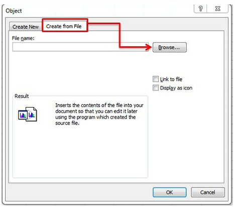 - Next, a dialog window will pop up with two tabs which name “Create New” and “Create from File”. Click “Create from File” tab and browse for the selected file to insert into the Excel worksheet.