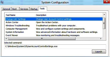 - In tools tab, choose Change UAC Settings and click Launch button.