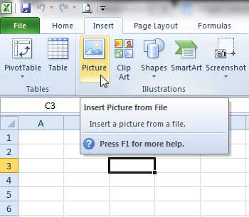 Excel 2007 & 2010 – Select “Picture” from the illustrations group on the Insert menu ribbon