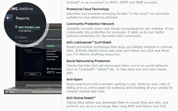 AVG Anti-Virus 2016 combines all the necessary safety features such as Anti-Virus, Anti-Malware, Anti-Rootkit, Email Scanner, Protective Cloud Technology, and Social Networking Protection. While AVG Internet Security 2016 includes the features AVG Firewall, AVG Anti-Spam, AVG Social Networking Security, and AVG Link Scanner to prevent malware spreading through search engines, email and social websites.